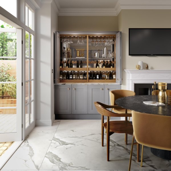 Extend your kitchen design into your dining area with an exquisite drinks dresser featuring oak glass holders, bottle racks and bi-fold doors for a touch of luxury.