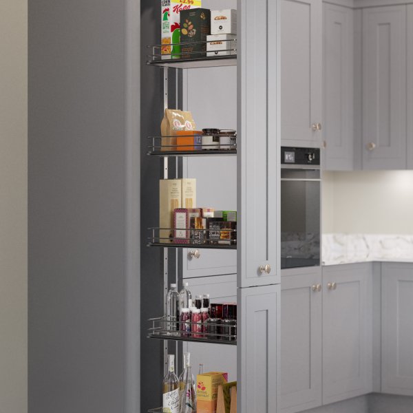 Tall narrow spaces can be maximised with a VS TAL® Larder and easily access everyday essentials with a VS COR® Flex corner pull-out.