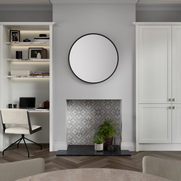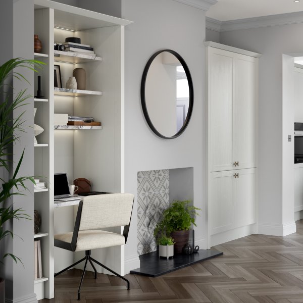 The versatility of Aldana lends itself beautifully to other areas within the home. Features such as plain glazed frames, triple panel doors and decorative shelving creates impressive custom-built furniture, such as a media unit with integrated workstation as shown above.