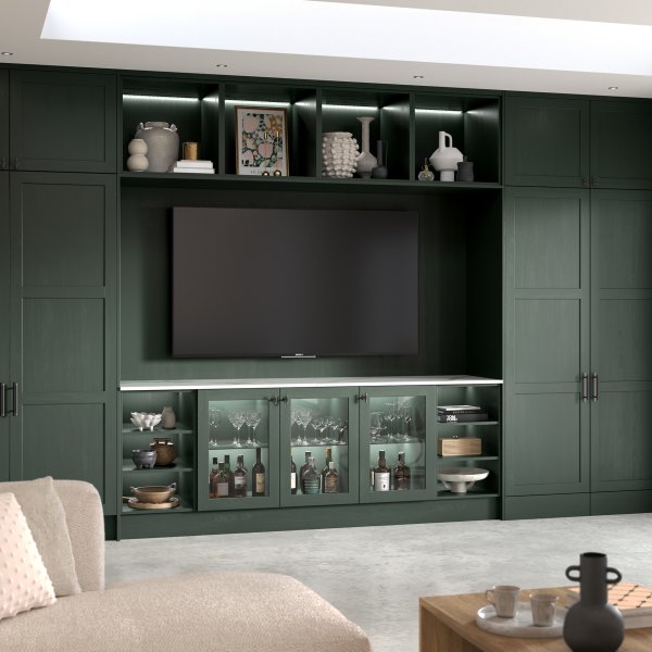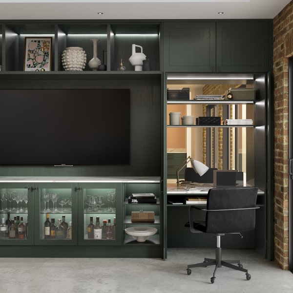 The versatility of Aldana lends itself beautifully to other areas within the home. Features such as plain glazed frames, triple panel doors and decorative shelving creates impressive custom-built furniture, such as a media unit with integrated workstation as shown above.