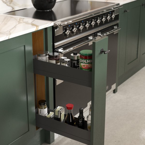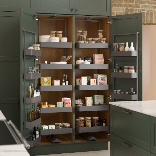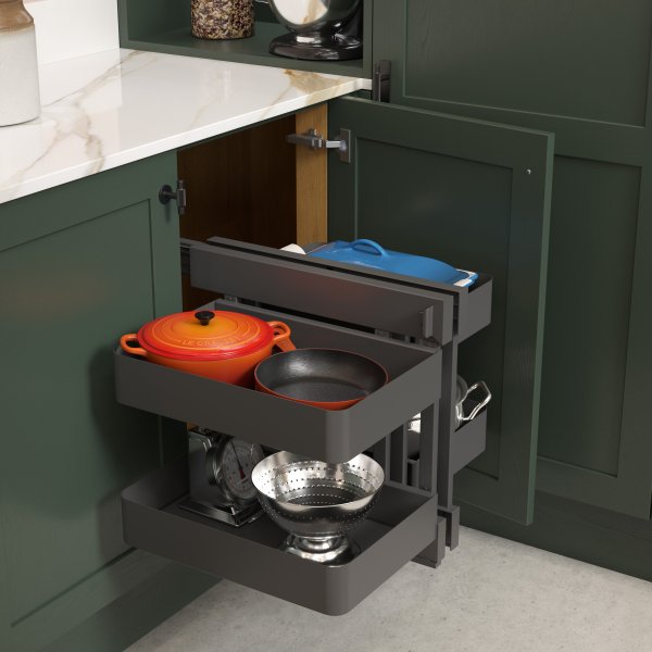 Consider internal storage solutions to bring order to your kitchen. Maximise awkward spaces with the VS COR® Flex corner pull-out and the VS SUB® Slim base pull-out. For optimal organisation, a VS TAL® Gate Pro offers storage on both the door and cabinet.