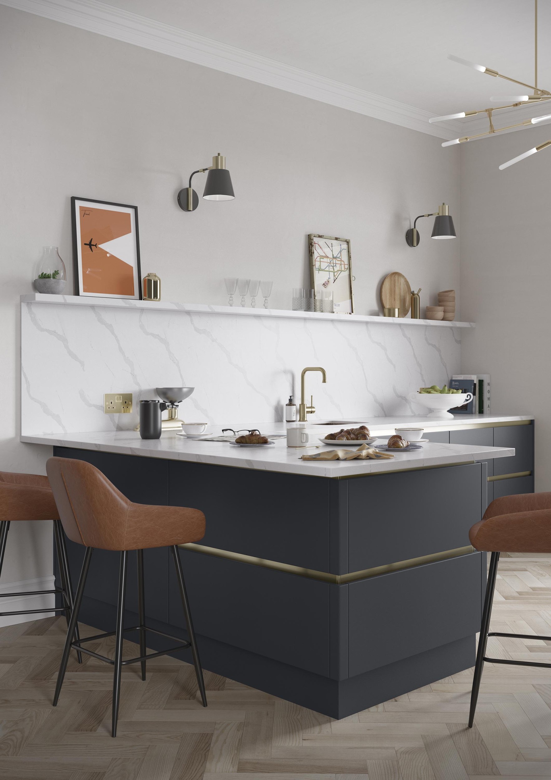 A multi-functional island offers additional worktop space and spacious drawers for additional storage, enhancing the kitchen’s seamlessly sleek aesthetic.